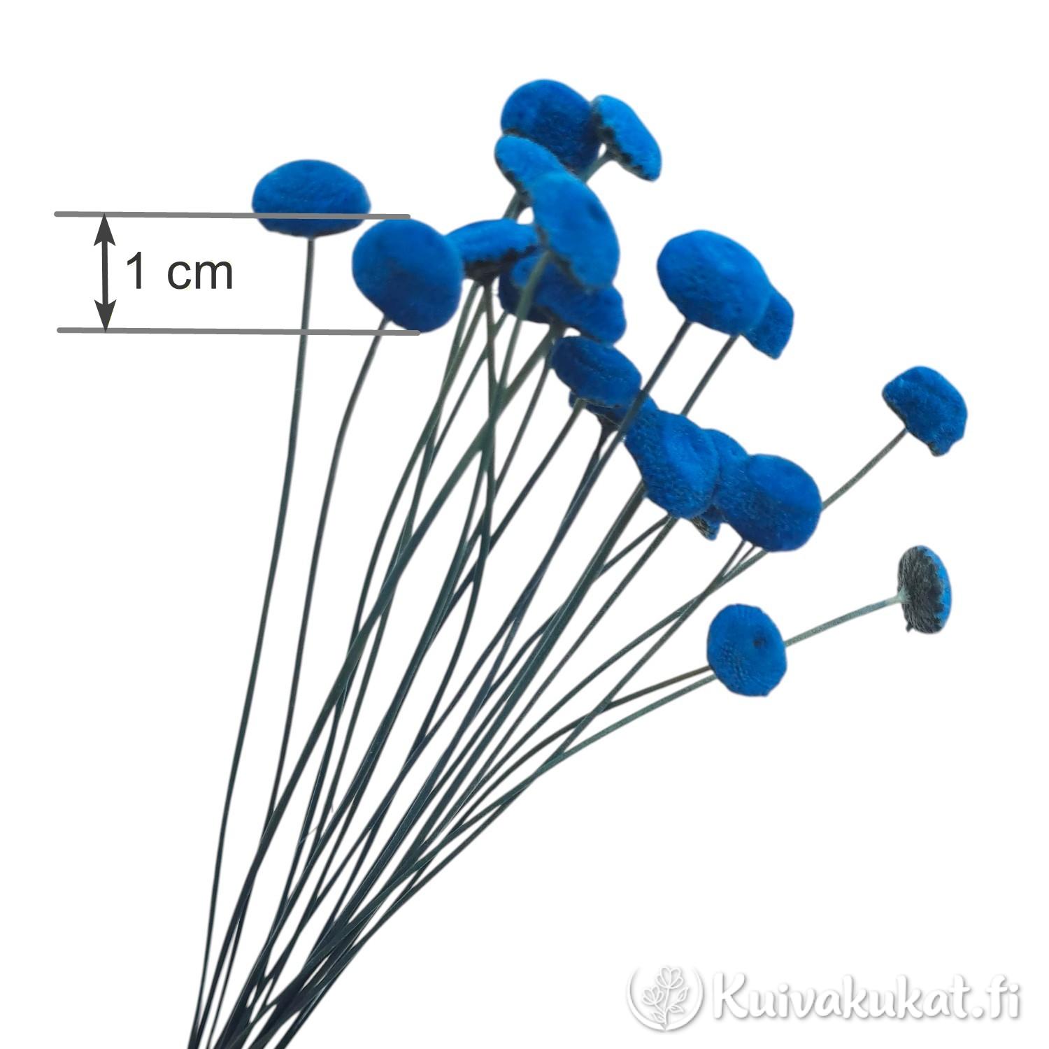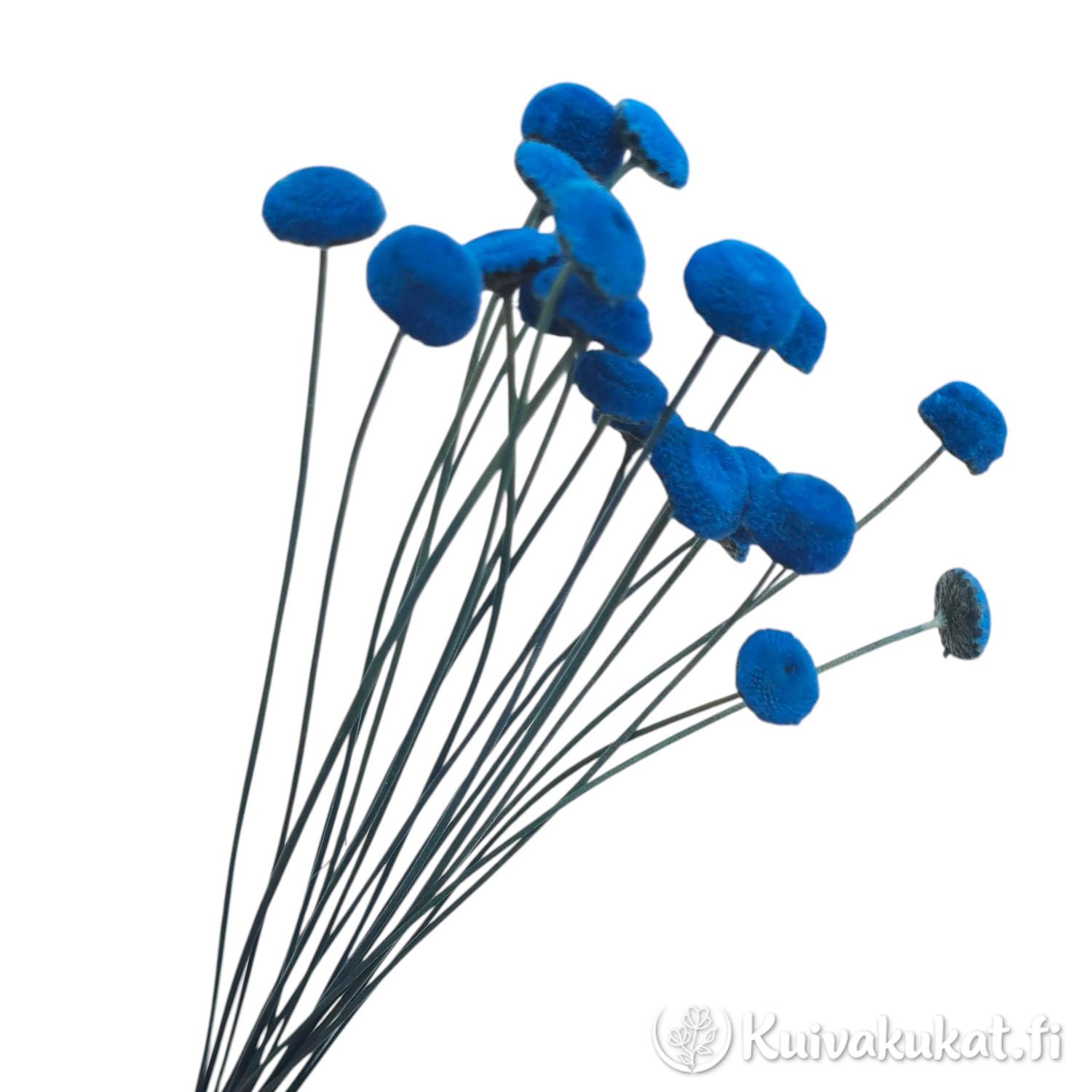 Botao (Syngonanthus elegans) on siro ja rakenteeltaan yksityiskohtainen luonnonmateriaali. Tässä nipussa on 20 kappaletta ohutvartisia kukkia, joiden latvassa on pieni, noin yhden senttimetrin kokoinen napinmuotoinen kukinto. Kukinnot on stabiloitu ja värjätty intensiiviseen, sähköiseen kirkkaansiniseen sävyyn (sähkönsininen). Stabilointiprosessin ansiosta kukat ja varret säilyttävät pehmeytensä ja joustavuutensa, mikä tekee niistä huomattavasti helpompia työstää ja vähemmän varisevia kuin perinteiset kuivakukat. Tämä rohkea ja moderni väri tuo asetelmiin dramaattista korostusta.