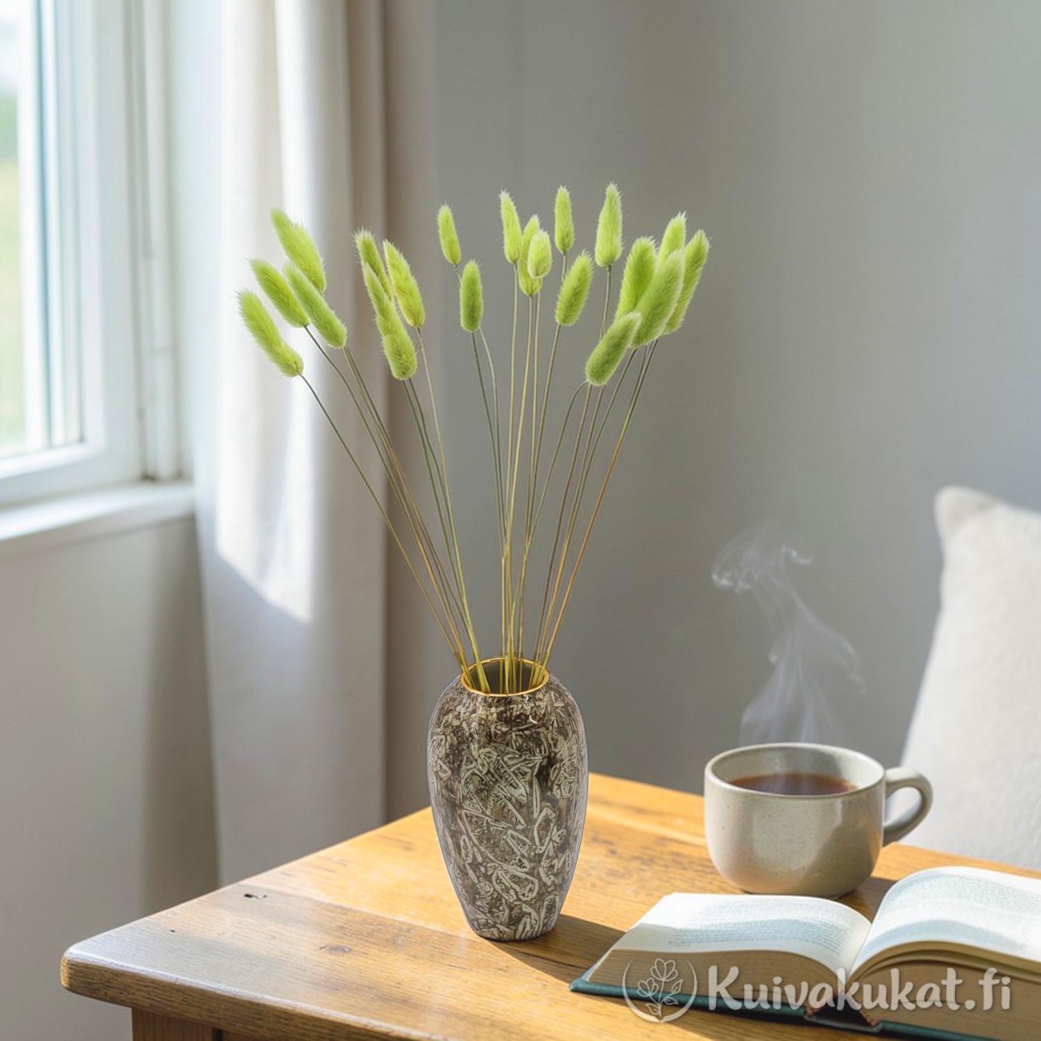 Raikas limenvihreä Jänönhäntä tuo asetelmiin energiaa ja keväistä vehreyttä. Tämä floristilaatuinen kuivakukka on käsin siistitty ja täysin varisematon.