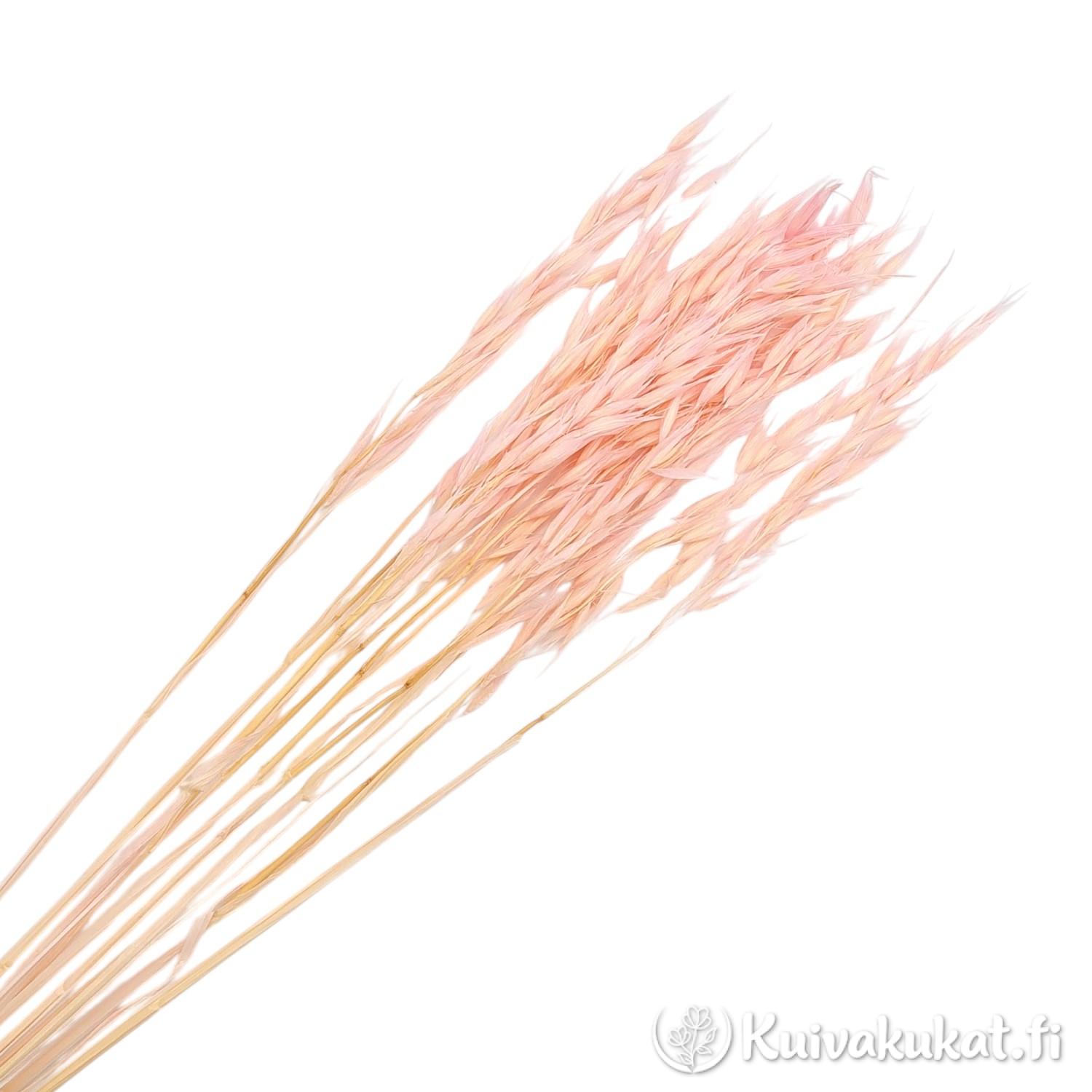 Kaura (Avena sativa) on monikäyttöinen luonnonmateriaali, joka on käsitelty kestämään ja säilyttämään sävynsä pitkään. Tämä erä on ensin valkaistu tasaisen vaalean pohjan saavuttamiseksi ja sen jälkeen värjätty erittäin vaalealla puuteriroosalla sävyllä. Kauran sirot, alaspäin taipuvat röyhyt tuovat asetelmiin luonnollista liikettä ja ilmavuutta.