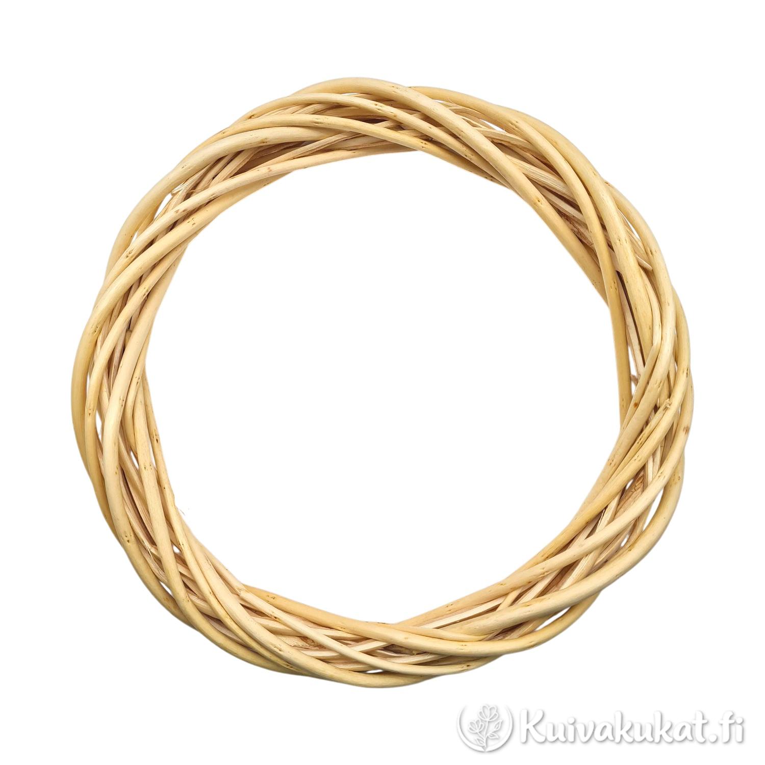 Tämä 25 cm kranssipohja on valmistettu kestävästä, kuoritusta rottingista (Calamus rotang). Punonta on tiivis ja tasainen, mikä antaa varman ja tukevan pohjan erilaisille kukkasidontatöille. Kuoritun rottingin luonnollinen, vaalea oljen- tai hiekkasävy on neutraali, joten se ei riitele käytettävien kukkien värien kanssa, vaikka osa pohjasta jätettäisiin näkyviin. Rottinkipohja on kevyt käsitellä, ja siihen on helppo kiinnittää materiaaleja joko perinteisellä sidontalangalla tai kuumaliimalla.