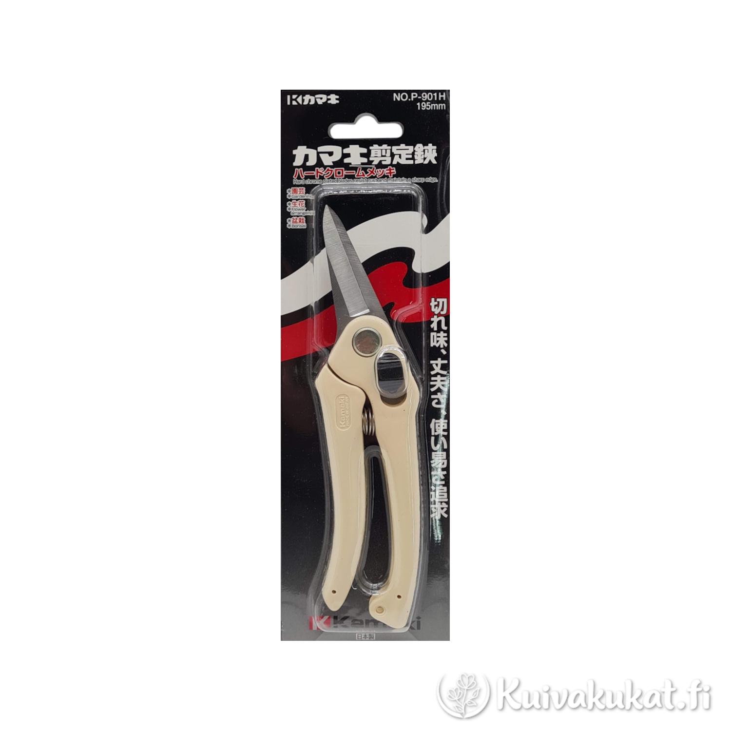 Kamaki P901H -sakset ovat kestävä ja käytännöllinen työkalu kukkasidontaan sekä kuivakukkien työstöön. Japanilaisesta hiiliteräksestä valmistetut ja kovakromatut suorat terät on suunniteltu leikkaamaan kukkien varret siististi. Puhdas ja suora leikkuujälki estää kasvin varren murskautumisen, mikä on tärkeää sekä tuoreiden kukkien vedenimemisen että ohuiden kuivakukkavarsien eheyden säilymisen kannalta.