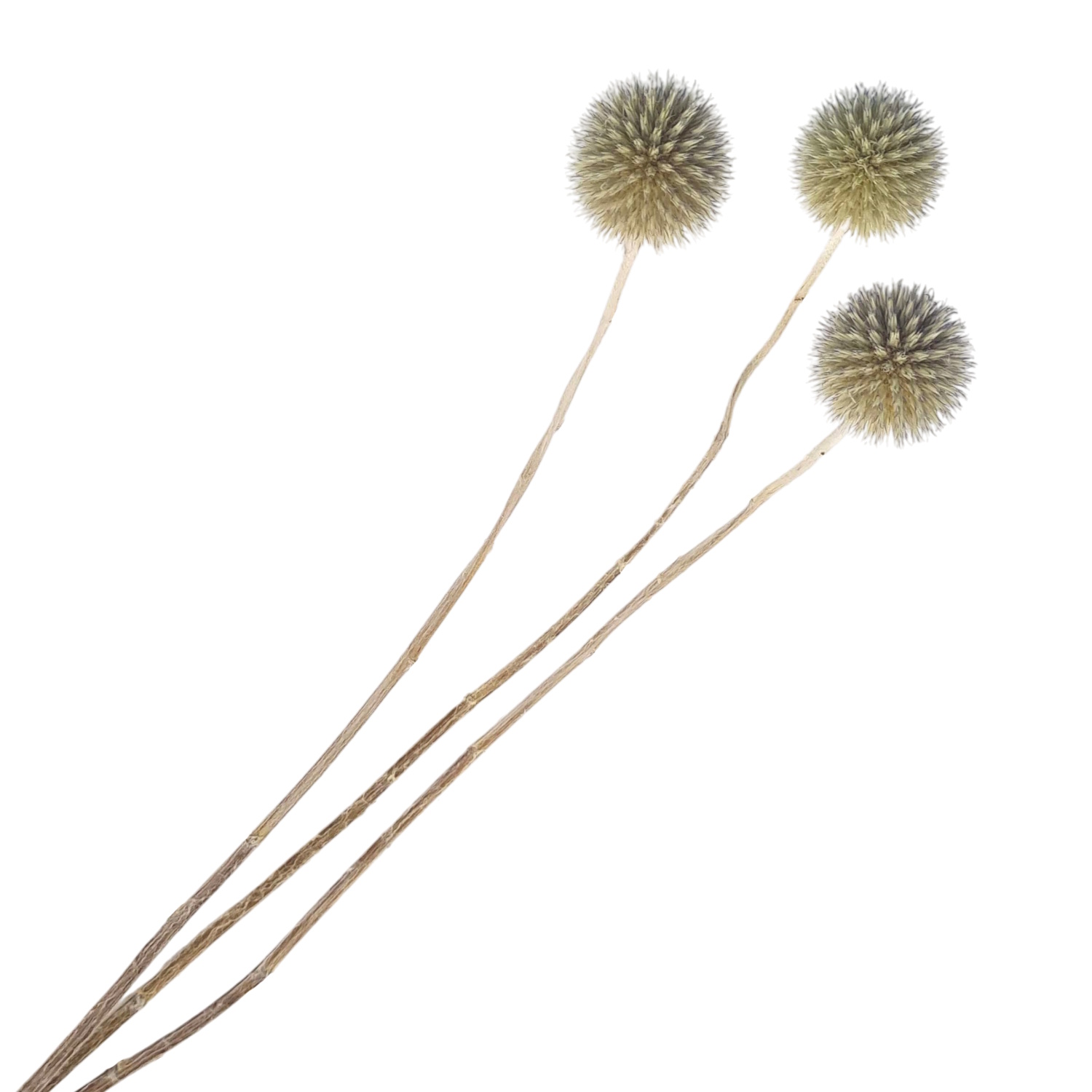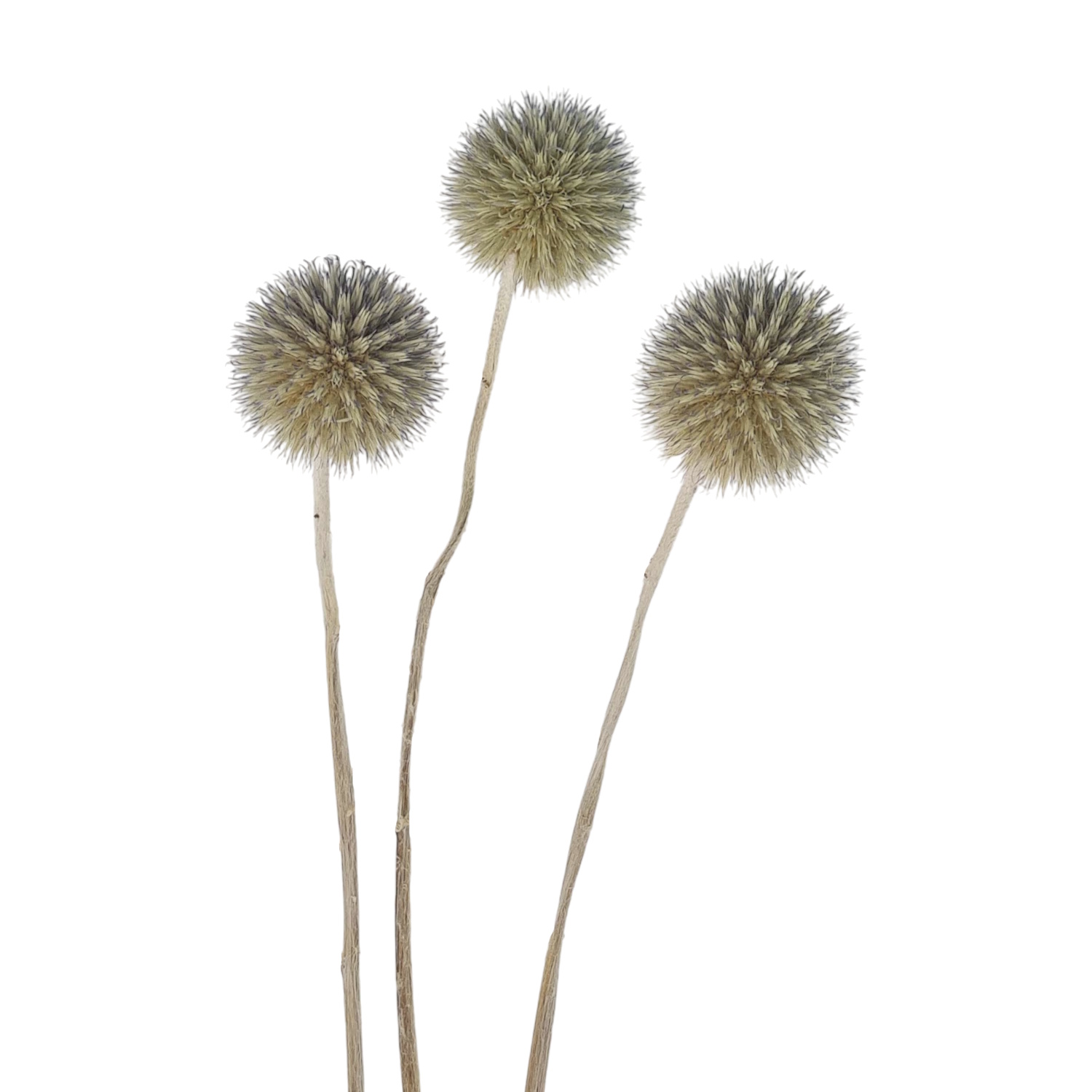 Sinipallo-ohdake (Echinops bannaticus) on tunnettu sen täydellisen pyöreistä, piikikkäistä kukinnoista. Tässä tuotteessa varret on huolellisesti puhdistettu lehdistä, mikä korostaa kasvin minimalistista ja arkkitehtonista muotoa.