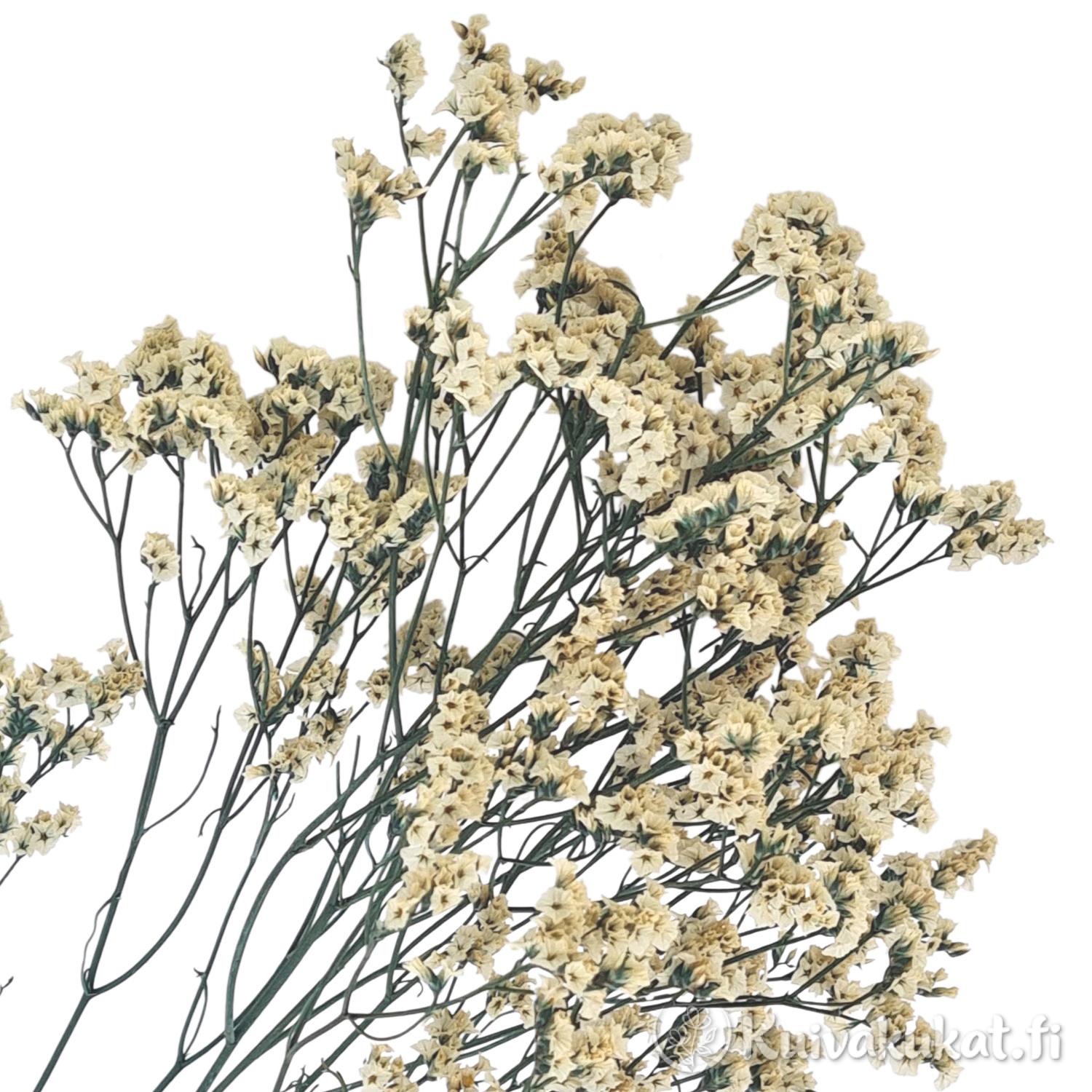 Tämä Tataariviuhko (Limonium tataricum) yhdistää kuivakukan kestävyyden ja tuoreen kasvin värimaailman. Kasvi on käsitelty imemismenetelmällä, jossa sen varret on värjätty syvän vihreiksi (smaragdinvihreä). Tämä luo voimakkaan ja raikkaan kontrastin kasvin luonnollisen vaaleille, kermanvalkoisille kukinnoille.